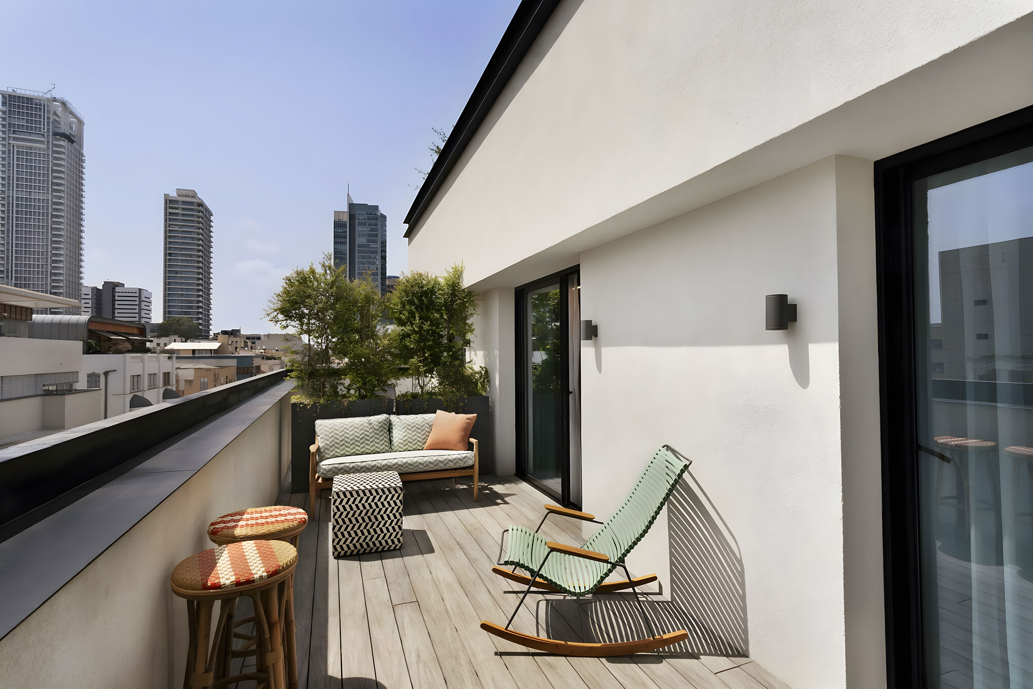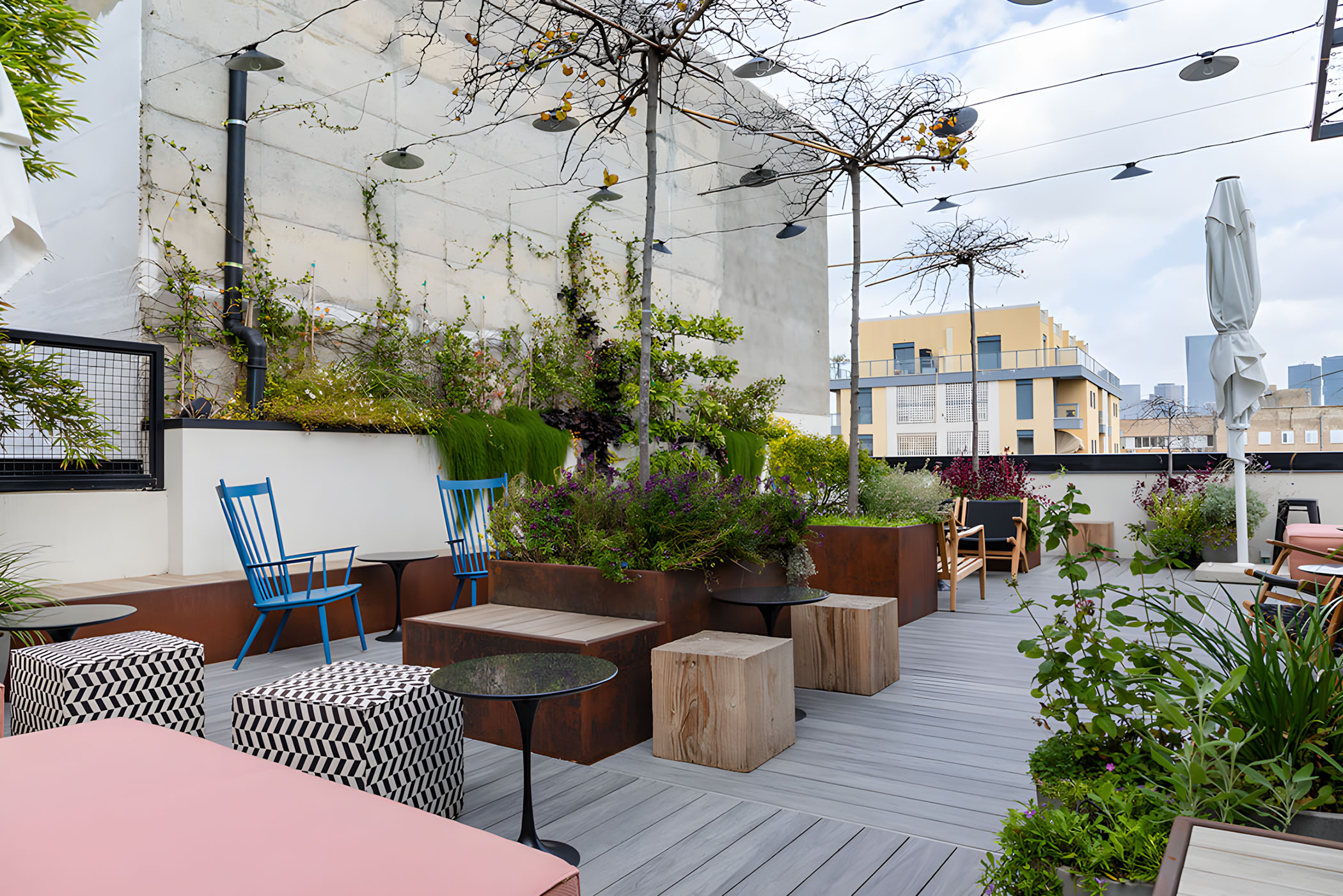 Les espaces communs prolongent l’expérience tel-avivienne, avec un lobby conçu comme un « salon de quartier », favorisant échanges et convivialité. Le Bushwick All Day Cocktail Bar, inspiré de Brooklyn, apporte une touche new-yorkaise audacieuse, tandis que le rooftop jardin offre une vue ouverte sur l’horizon urbain de Tel Aviv.