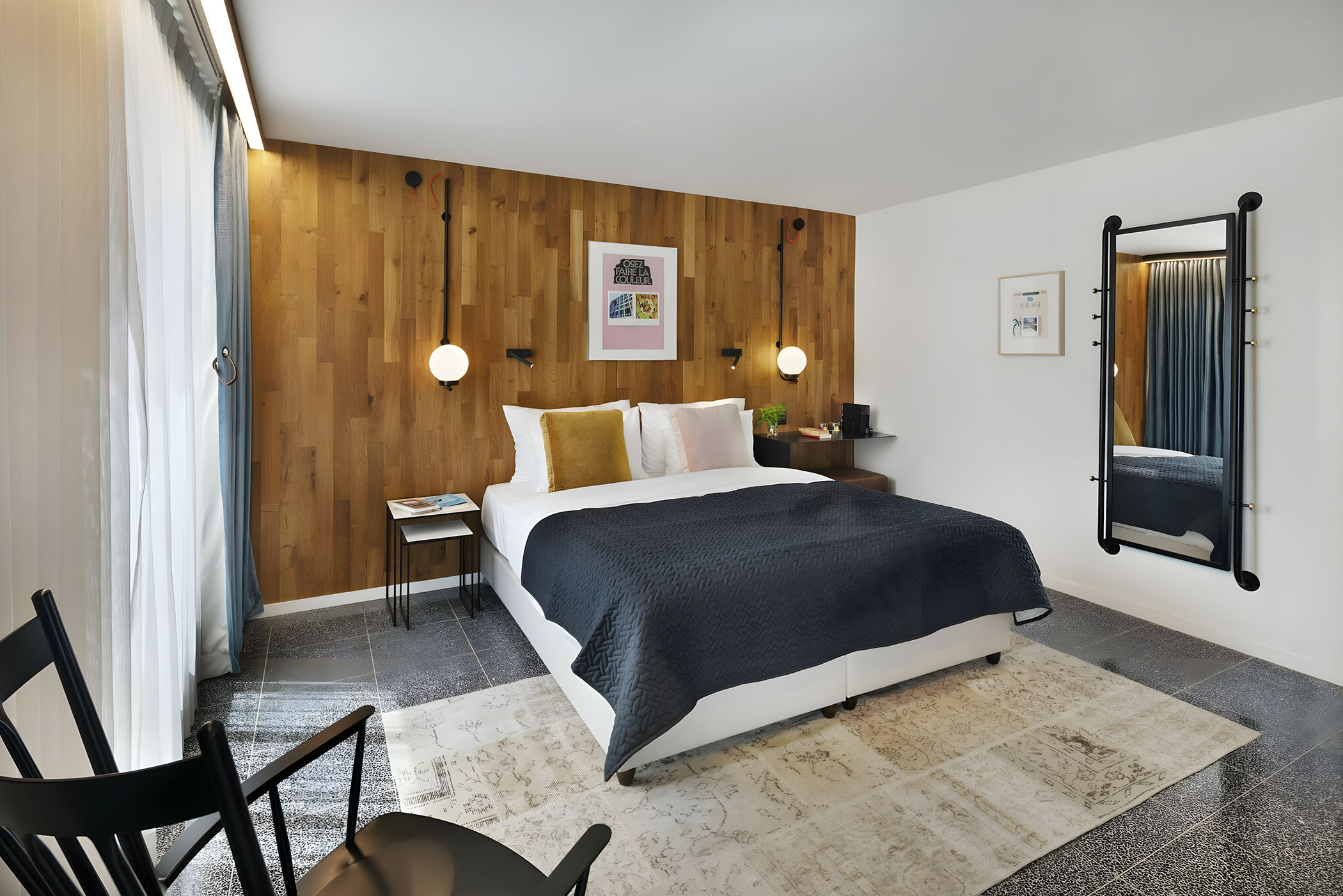 L’hôtel dispose de 43 chambres au design chaleureux et soigné, mêlant esprit industriel, art contemporain et élégance cosmopolite. Pensées comme de véritables refuges urbains, les chambres offrent une atmosphère accueillante, idéale pour se détendre après une journée de découvertes dans la ville effervescente.